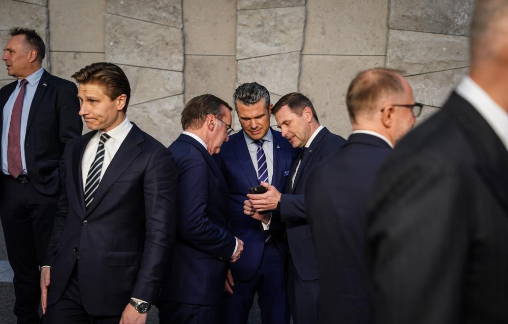 2025年10月15日,在比利时布鲁塞尔举行的北约防长会议结束后,美国国防部长赫格塞思(中)与欧洲国家官员交谈。新华社记者彭子洋摄