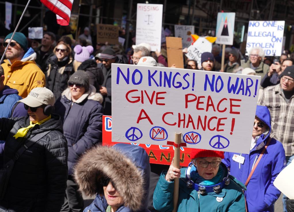 3月28日,人们在美国纽约参加“不要国王”抗议活动。前面这名抗议者手举的牌子上写着:“不要国王!不要战争!给和平一个机会!”新华社记者张凤国摄