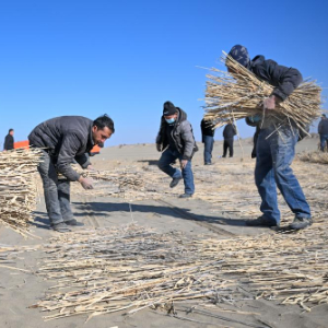 寒冬时节,尽管塔克拉玛干沙漠南缘的新疆和田地区墨玉县气温跌破零摄氏度,这里却涌动着治沙攻坚的热潮。数十台推土机轰鸣作业,推筑阻沙堤、平整沙丘,本地农户忙着收割加工芦苇、铺设草方格,冬季治沙工程高效推进。