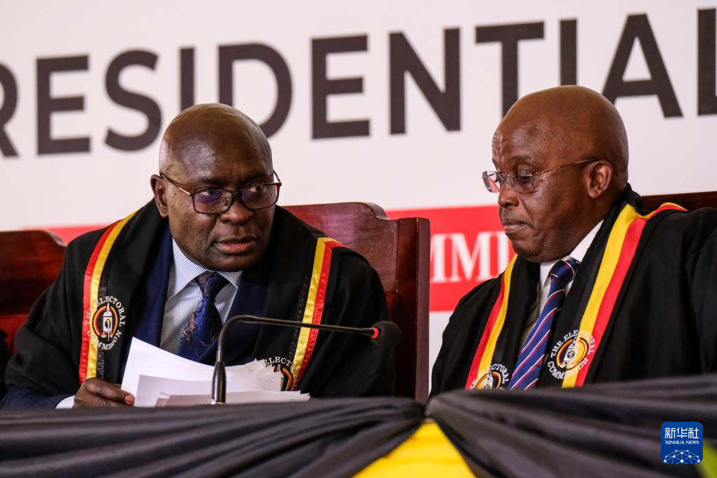 1月17日,在乌干达首都坎帕拉国家计票中心,乌干达选举委员会主席西蒙·比亚巴卡马(左)宣布总统选举结果。新华社发(阿佳拉·纳瓦达摄)