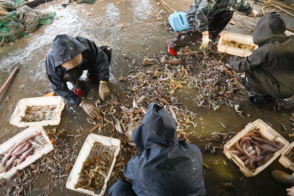 1月28日,船员在船上分拣刚收网的海鲜。新华社记者肖恩楠 摄