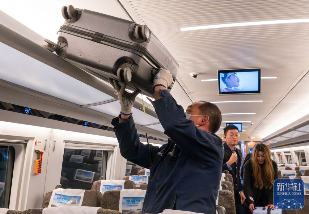 2月2日,在上海南站,铁路“轻装行”的工作人员将程燚的行李放置在车厢内的行李架上。