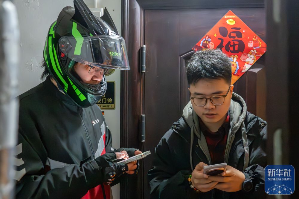 2月2日,在湖北武汉江岸区的家中,程燚(右)从快递员手中领取行李。
