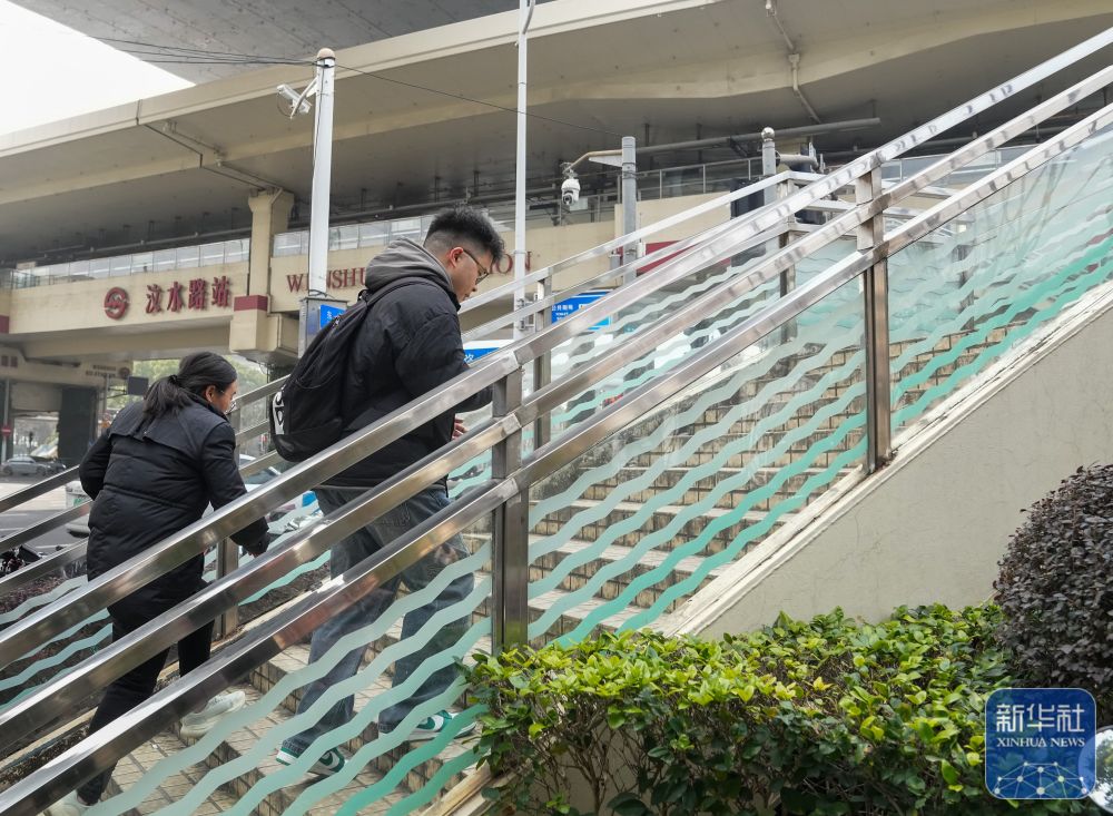 2月2日,程燚(右二)前往湖北武汉汉口火车站出站口。