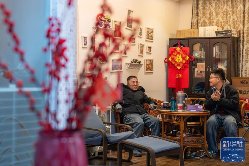2月2日,在湖北武汉江岸区的家中,程燚(右)与家人聊天。