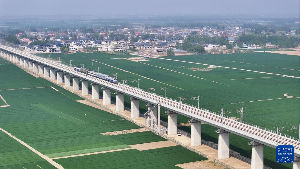 4月15日,检测列车通过雄商高铁任丘特大桥(无人机照片)。新华社发(王观生 摄)