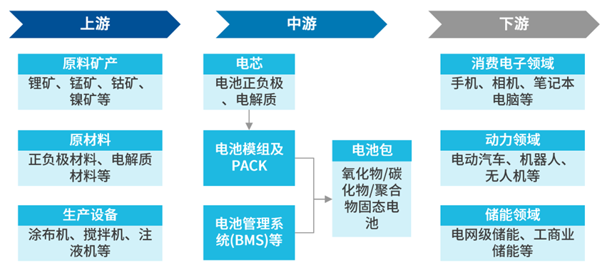 简单来说,锂电池产业链就是从关键材料和专用设备(上游),经过电池设计制造(中游),最终应用到消费电子、动力、储能等各种领域(下游)的过程: