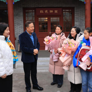 1月4日,中华英烈褒扬事业促进会会长李中水(左二)和爱心人士贾秀芳(左一)给“海空卫士”王伟烈士妻子阮国琴(右二)、“人民英雄”张超烈士女儿张上明珠(右一)、卫国戍边英雄肖思远烈士母亲刘利霞(左三)三位烈属代表送上鲜花与节日慰问品。