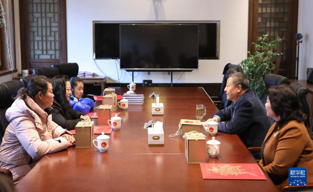 1月4日,在中华英烈褒扬事业促进会,会长李中水(右二)、爱心人士贾秀芳(右一)和“海空卫士”王伟烈士妻子阮国琴(左二)、“人民英雄”张超烈士女儿张上明珠(左三)、卫国戍边英雄肖思远烈士母亲刘利霞(左一)交流。