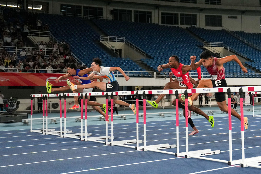 9月7日,日本选手阿部竜希(左一)、中国选手徐卓一(左二)和陈圆将(右一)在男子110米栏比赛中。新华社记者 鞠焕宗 摄