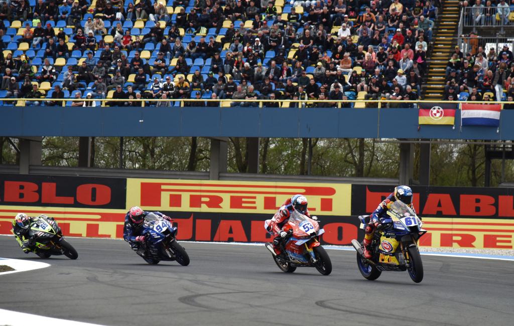4月18日,“张雪机车”车队法国车手瓦伦丁·德比斯(右二)在比赛中。新华社记者 邵海军 摄