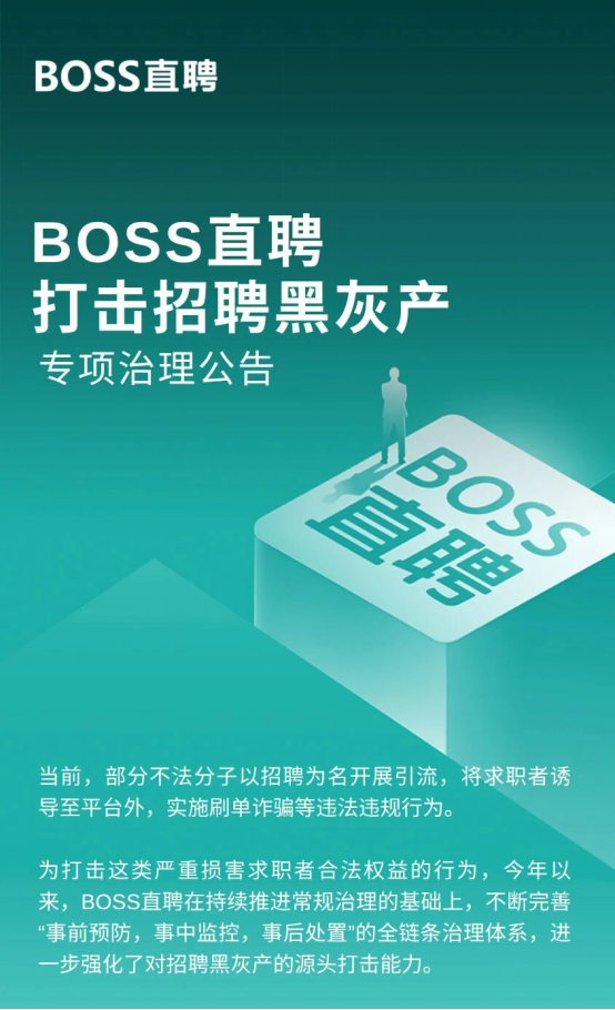 针对黑灰产组织化、隐蔽化的运作趋势,近日,BOSS直聘在日常治理的基础上,进一步加强了源头打击能力,并发布了打击招聘黑灰产的专项治理公告。