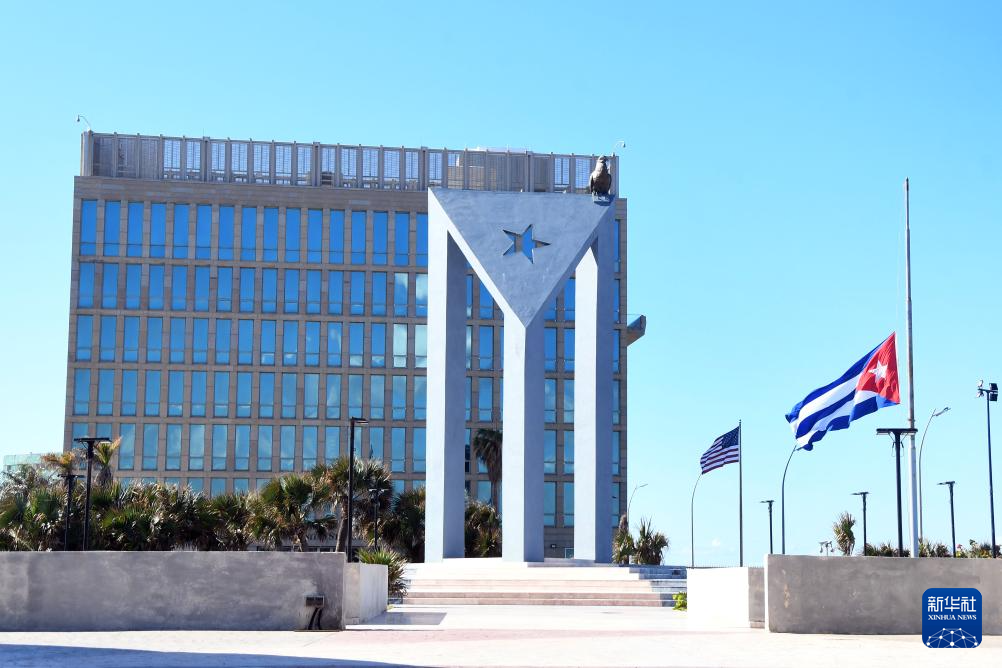 1月5日,在古巴首都哈瓦那,美国驻古巴大使馆前的古巴国旗降至旗杆中间。新华社发(华金·埃尔南德斯摄)