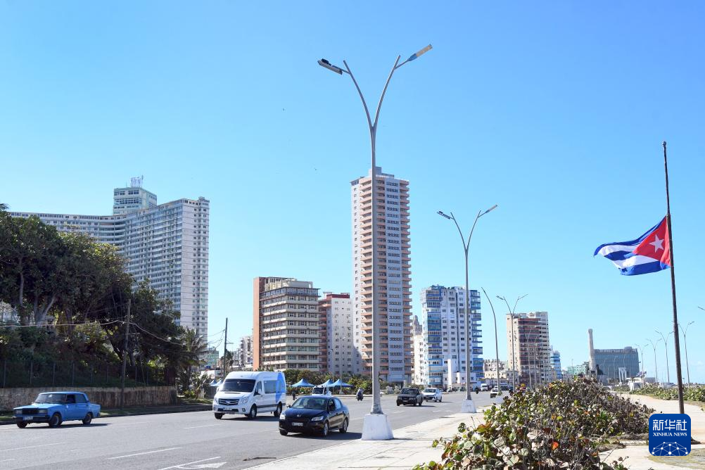 1月5日,在古巴首都哈瓦那,海滨大道上的古巴国旗降至旗杆中间。新华社发(华金·埃尔南德斯摄)