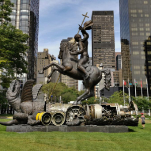 这是2019年8月5日在位于纽约的联合国总部拍摄的“善战胜恶”雕塑。这尊雕塑是苏联1990年为纪念《中导条约》签署和联合国成立45周年特地赠送给联合国的,由销毁的苏联和美国导弹零件铸成,刻画了代表正义的英雄杀死恶龙的场景。新华社记者李木子摄