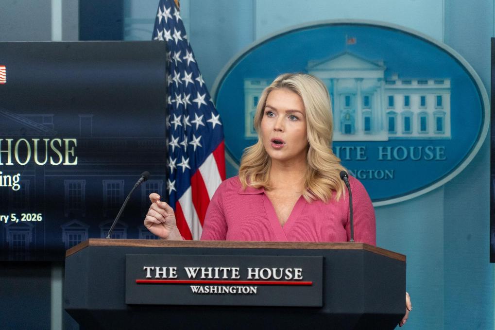 2月5日,在美国首都华盛顿白宫,白宫新闻秘书莱维特出席记者会。新华社发(李源清摄)