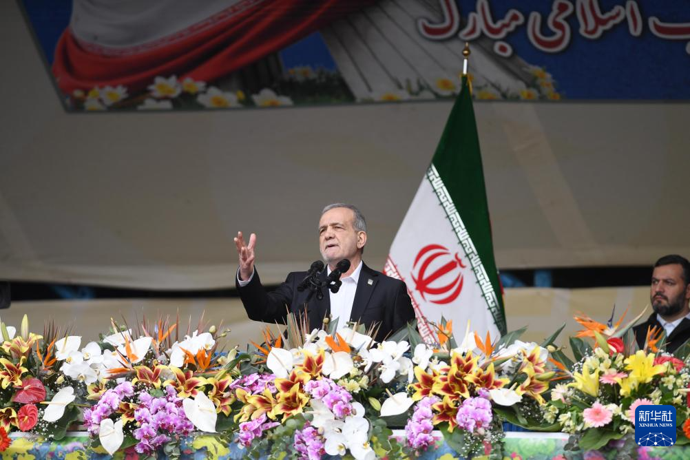 2月11日,伊朗总统佩泽希齐扬在德黑兰举行的伊朗伊斯兰革命胜利47周年庆典活动上讲话。新华社记者 沙达提 摄