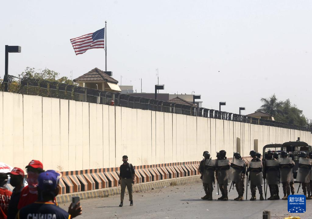 3月1日,执法人员(画面右侧)在巴基斯坦南部城市卡拉奇的美国驻卡拉奇领事馆外控制局势。新华社发(伊姆兰·阿里摄)