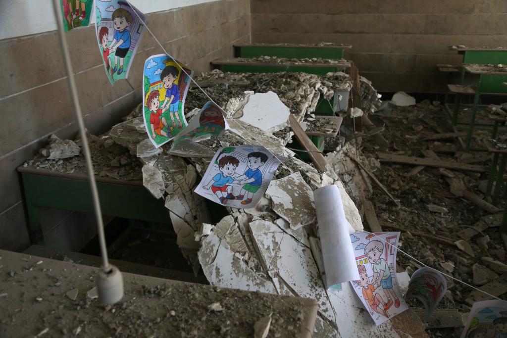 3月3日,在伊朗德黑兰市中心的沙希德·马哈拉提学校,教室内一片瓦砾。新华社记者沙达提摄