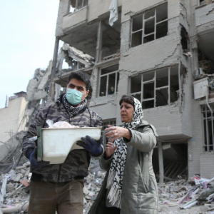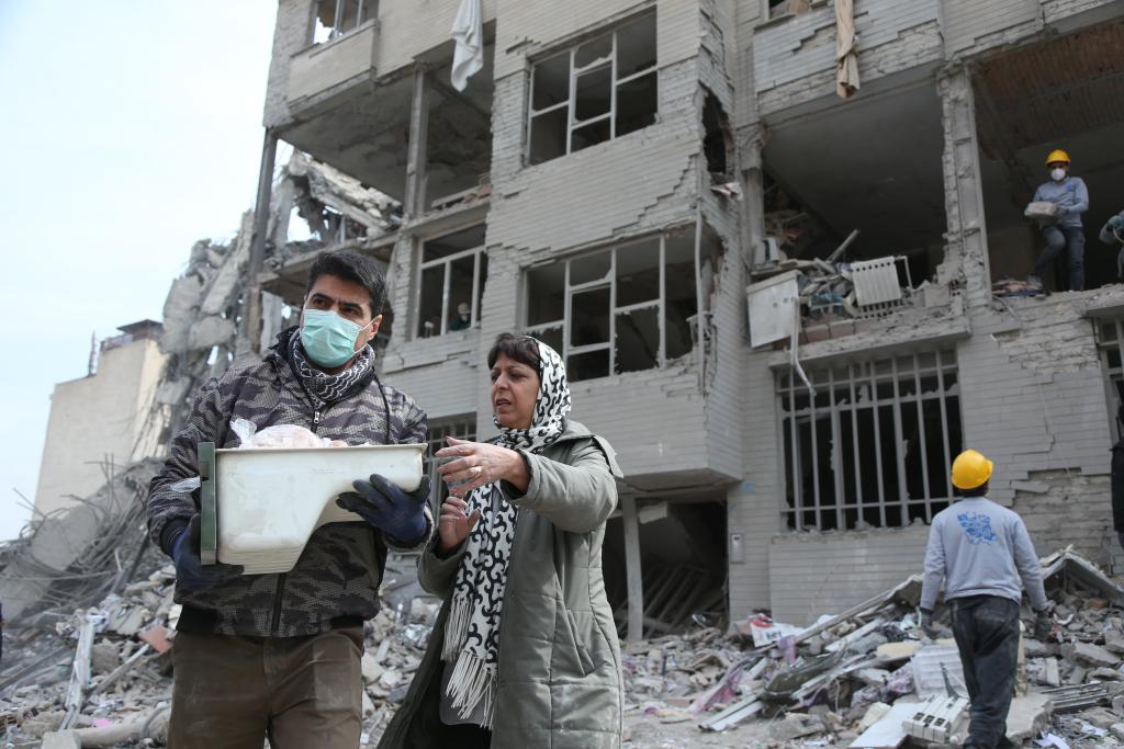 3月12日,在伊朗首都德黑兰,市民站在建筑废墟前。新华社记者沙达提摄