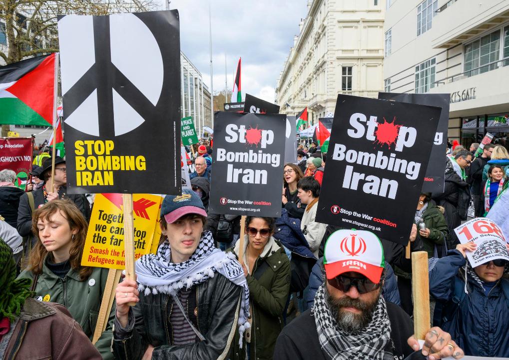 3月28日,人们在英国伦敦参加集会,抗议美国和以色列对伊朗发动军事打击。新华社发(雷伊·唐摄)