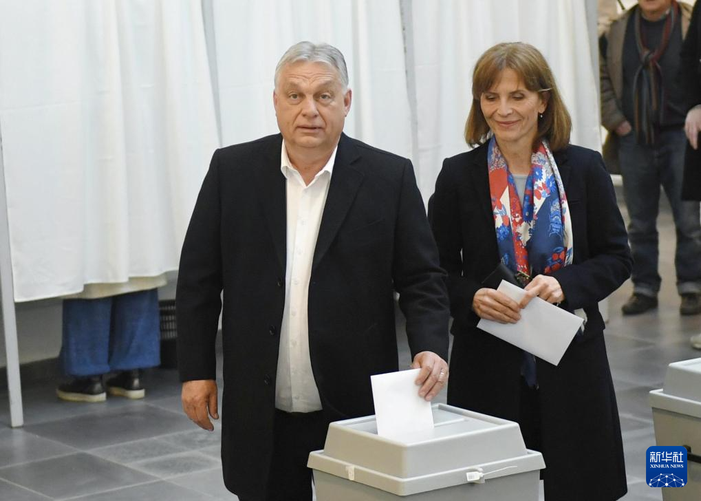 4月12日,在匈牙利首都布达佩斯,匈牙利总理欧尔班(左)和夫人在一处投票站投票。新华社记者 贺灿铃 摄