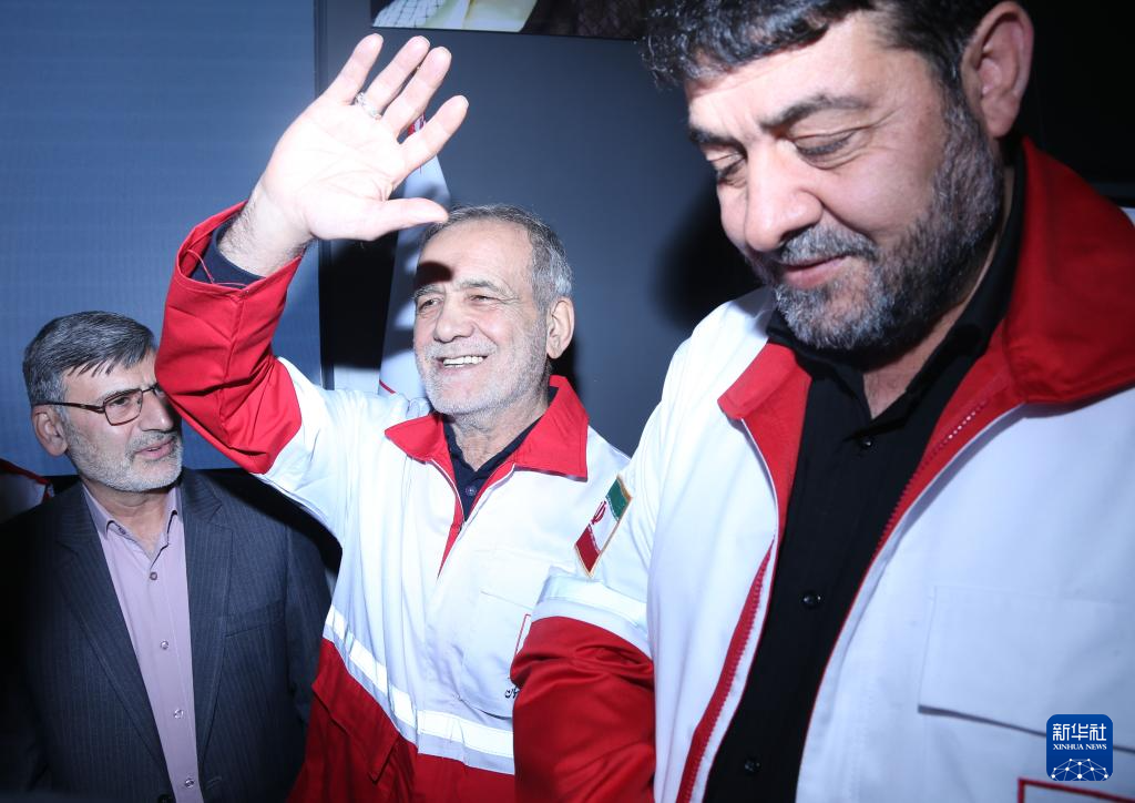 4月15日,在伊朗首都德黑兰,伊朗总统佩泽希齐扬(中)离开伊朗红新月会时向工作人员挥手致意。新华社记者 沙达提 摄