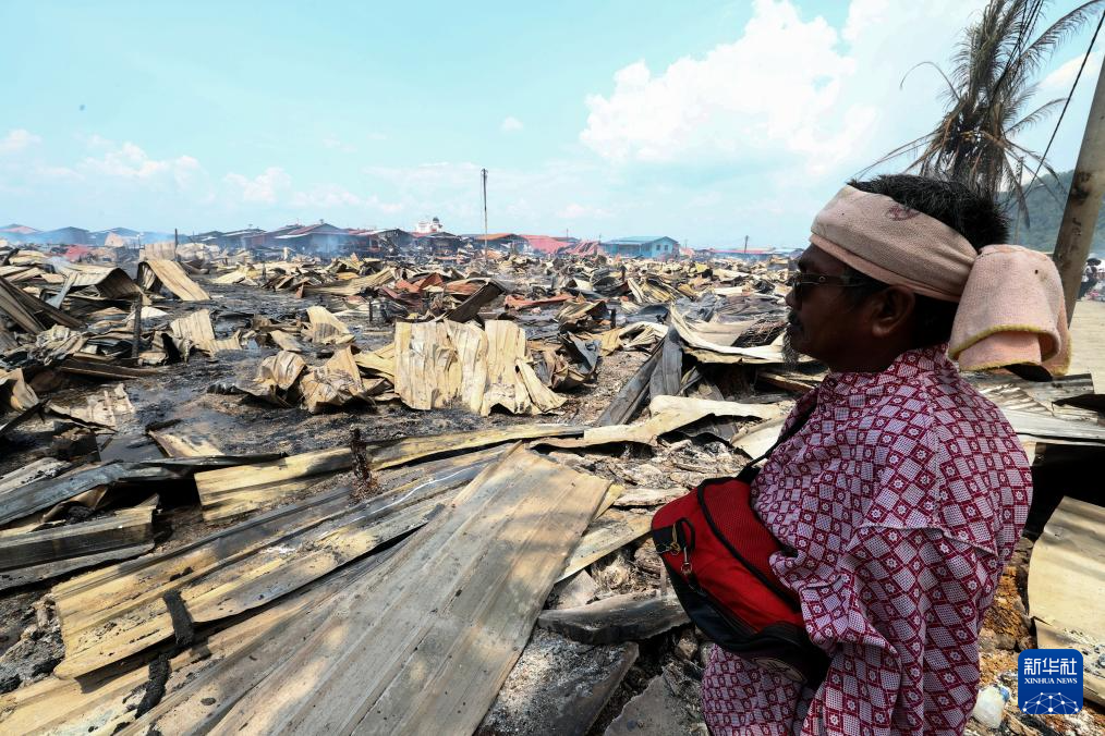 4月19日,在马来西亚沙巴州东海岸城市山打根,一名当地居民看向在火灾中焚毁的水上村庄房屋。新华社/马新社