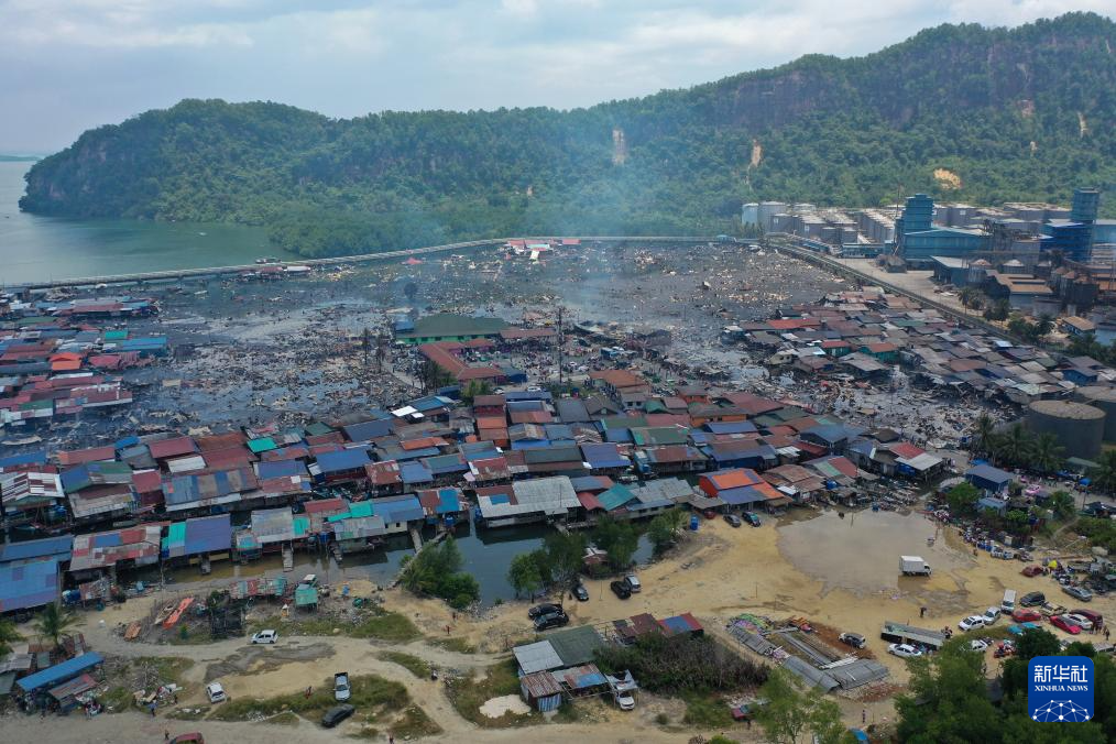 这是4月19日在马来西亚沙巴州东海岸城市山打根拍摄的发生火灾的水上村庄(无人机照片)。新华社/马新社