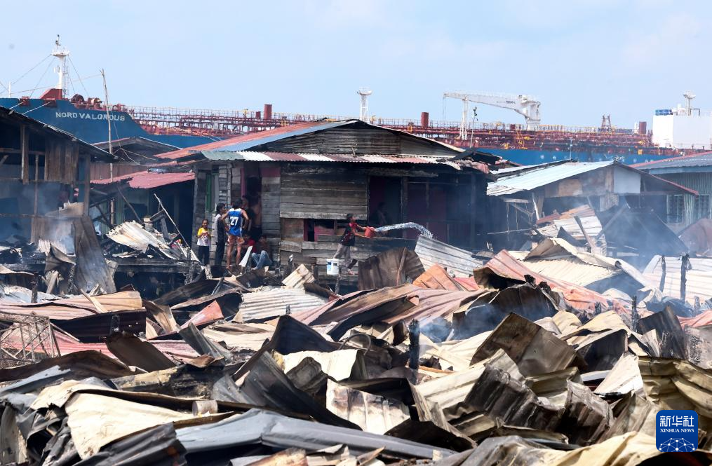 这是4月19日在马来西亚沙巴州东海岸城市山打根拍摄的在火灾中焚毁的水上村庄房屋。新华社/马新社