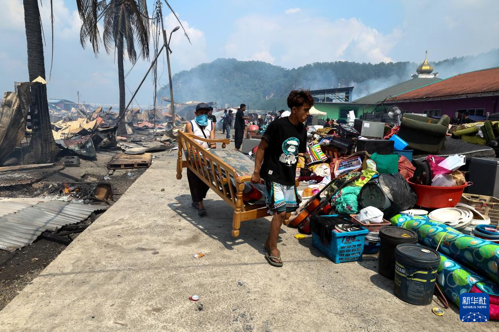 4月19日,在马来西亚沙巴州东海岸城市山打根发生火灾的水上村庄,当地居民转移抢救出来的物品。新华社/马新社
