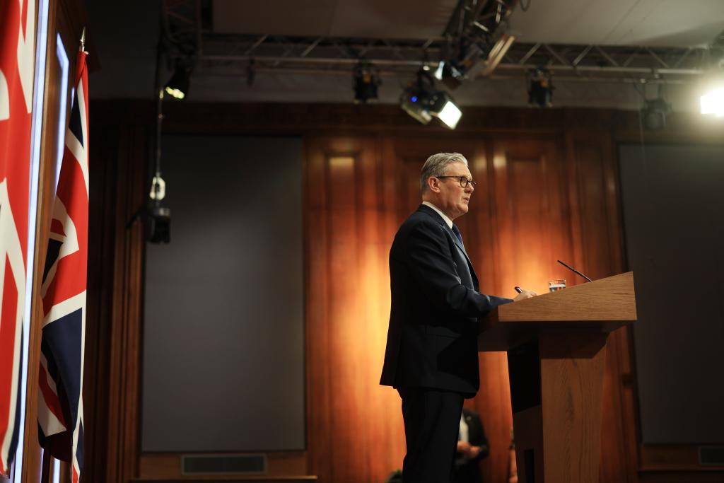 2026年4月1日,英国首相斯塔默在伦敦举行的新闻发布会上表示,英国将举办有关霍尔木兹海峡问题的线上国际会议。新华社发(英国首相府供图)